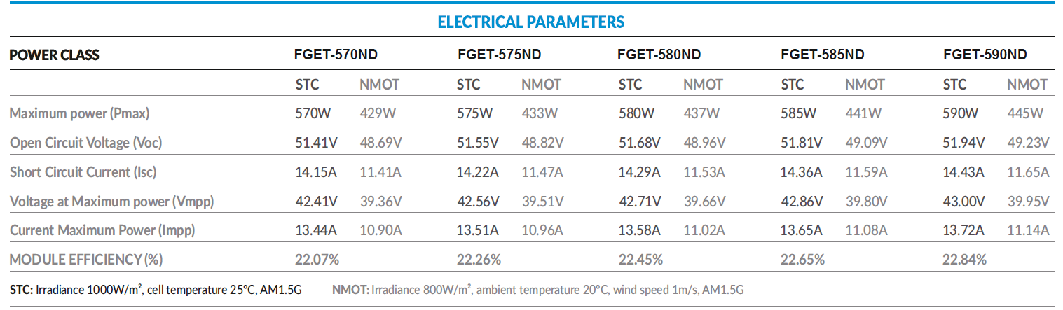 Применение технологии монокристаллических ячеек N-типа SMBB (Super Multi BusBar) размером 210–182 мм для солнечных элементов высокой мощности. Более высокая мощность компонентов эффективно снижает затраты на BOS системы. Артикул №: FG580-G12R Мощность: 565-585 Вт Количество ячеек: 108 шт. Минимальный заказ: 36 шт. Эффективность модуля (%): 22,52% Размеры: 2279*1134*34 мм Вес: 31,5 кг Количество в упаковке: 36 шт./поддон Контейнер 40'HQ: 20 поддонов / 720 шт.